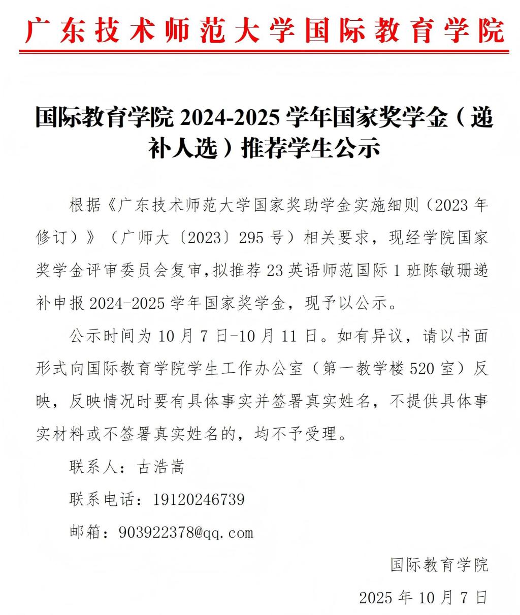 国际教育学院2024-2025学年国家奖学金(递补人选)推荐学生公示