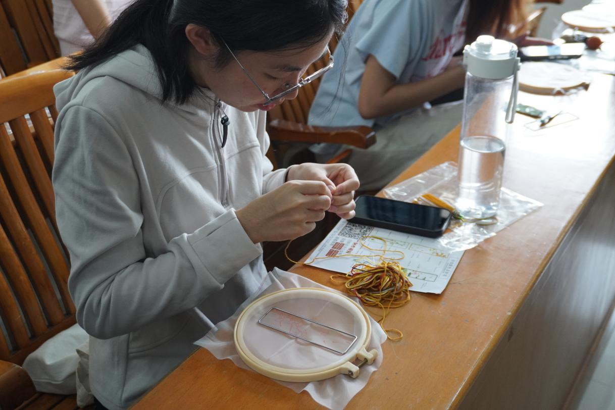 活动现场,广绣技艺指导团队以经典作品为切入点,通过投影直观解析各类特色针法的精妙逻辑。示范环节中,指导团队手持绣针精准演示核心技法,学子们围坐观摩、认真记录;实践阶段,大家从穿针引线学起,专注投入基础针法练习,在方寸绣绷间探索非遗文化的深厚底蕴。